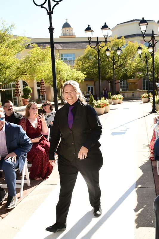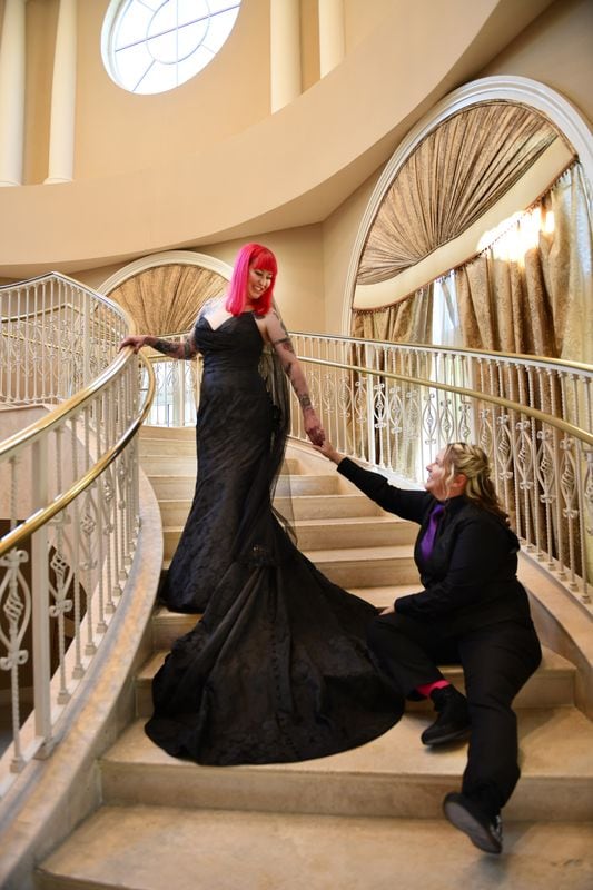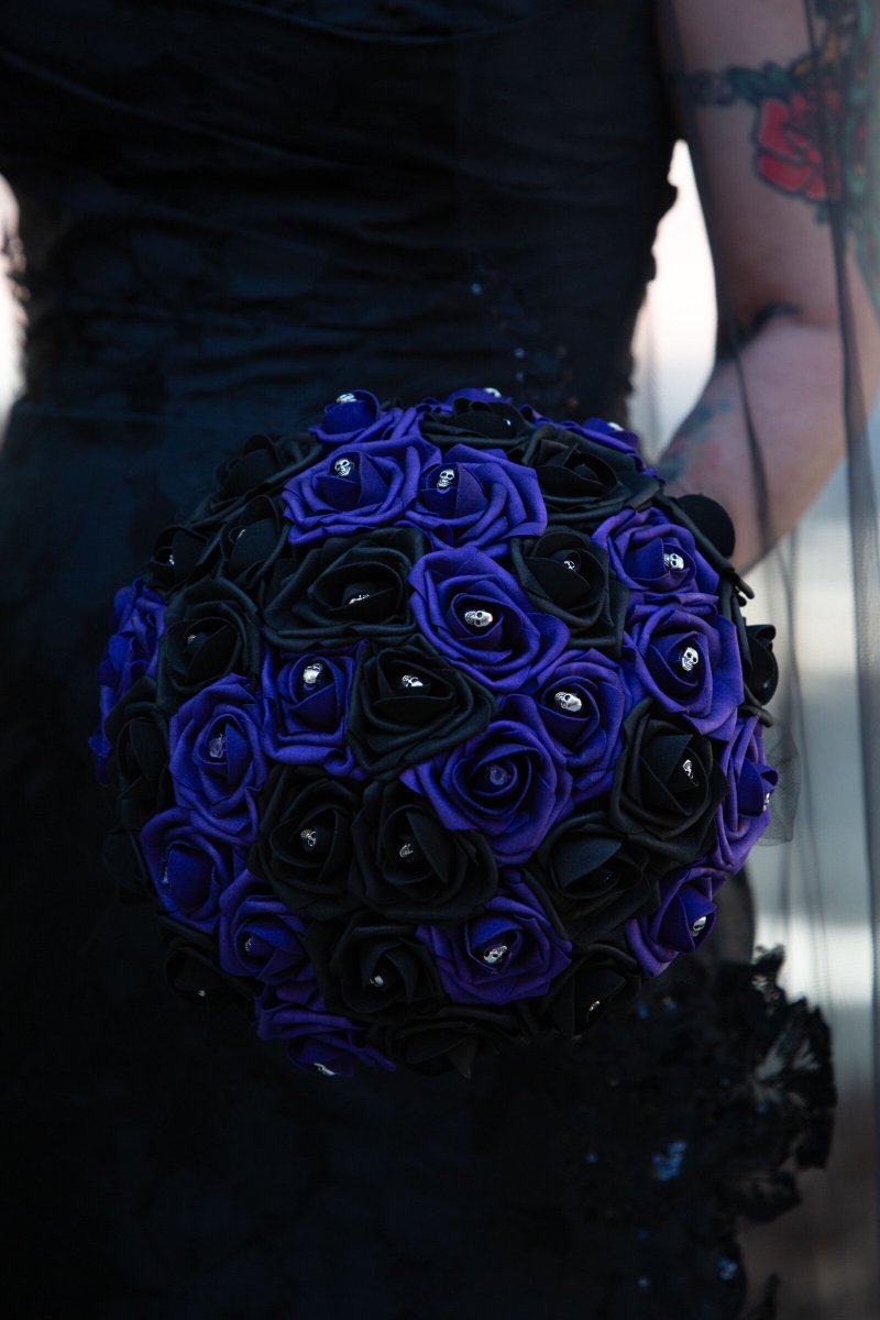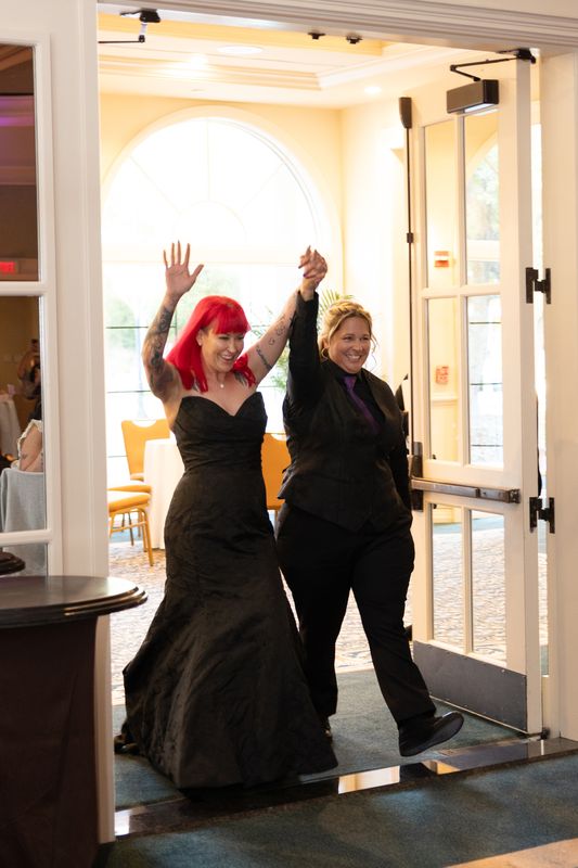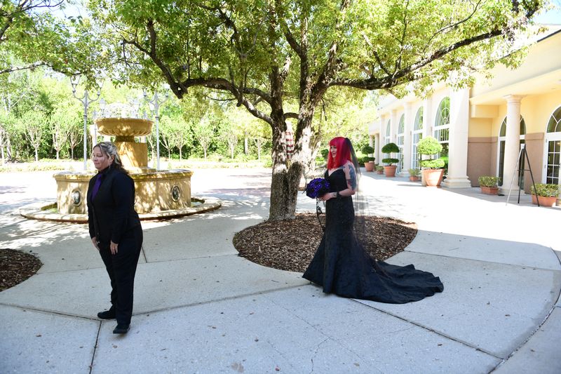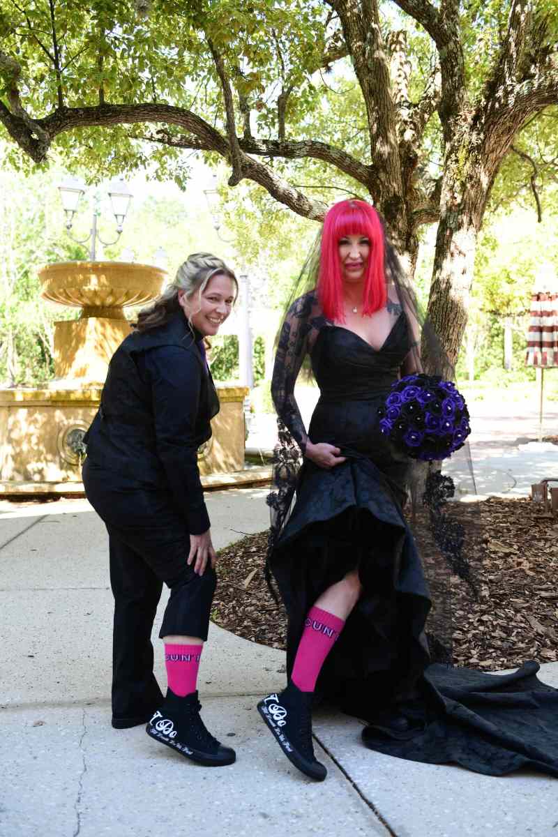 Ashlee looked absolutely stunning in her black Maggie Sottero gown, which added such a striking and elegant touch to the day. Lisa opted for a classic suit with a fun twist, wearing a black vest featuring an all-over skull design underneath. One of our favorite details was how Ashlee’s bouquet also included subtle skull accents — something she didn’t even realize Lisa had incorporated into her look as well. It felt like such a fun and meant-to-be moment!