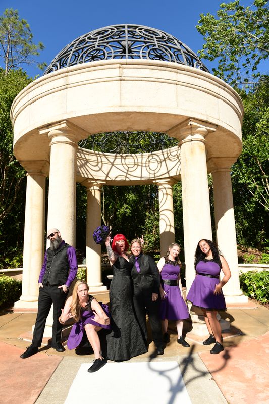 Lisa and Ashlee’s black and purple wedding at Portofino Bay Hotel was a bold and unforgettable celebration filled with edgy details and meaningful moments. The couple was married in April of last year at the stunning Loews Portofino Bay Hotel Citrus Piazza, where they brought their unique vision to life surrounded by their closest family and friends. We were so excited to be part of their day and help ensure everything came together seamlessly!