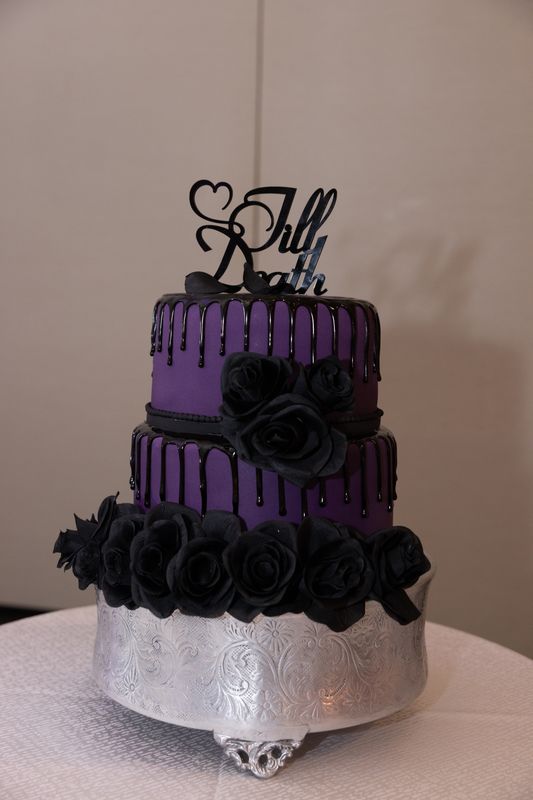 Their cake was another standout element of this black and purple wedding. The design featured black drippy icing, dramatic black roses, and a “’til death” cake topper, perfectly tying in their theme while adding a bold and modern edge to the reception décor.