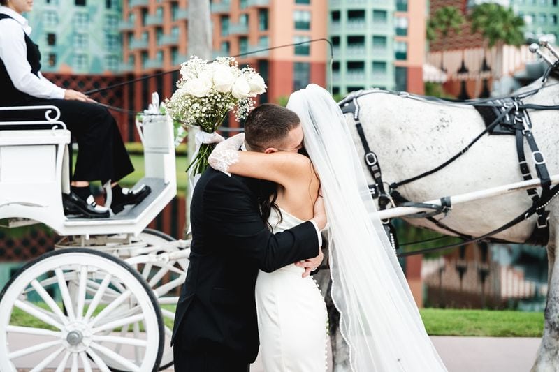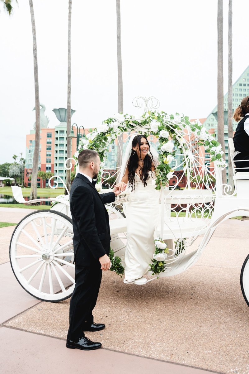 A Cinderella carriage set the tone for Stephanie and David’s dreamy June elopement at the Walt Disney World Swan Resort, creating a wedding day that felt straight out of a modern fairytale. This sweet couple chose to celebrate their love in the most intimate way possible with a just-the-two-of-them elopement. Even without guests, their day was filled with meaningful moments, classic style, and a little Disney magic woven in throughout. Although a rainy summer afternoon moved their ceremony indoors, it only added to the cozy, romantic feel of the day.