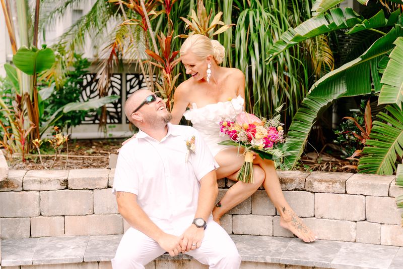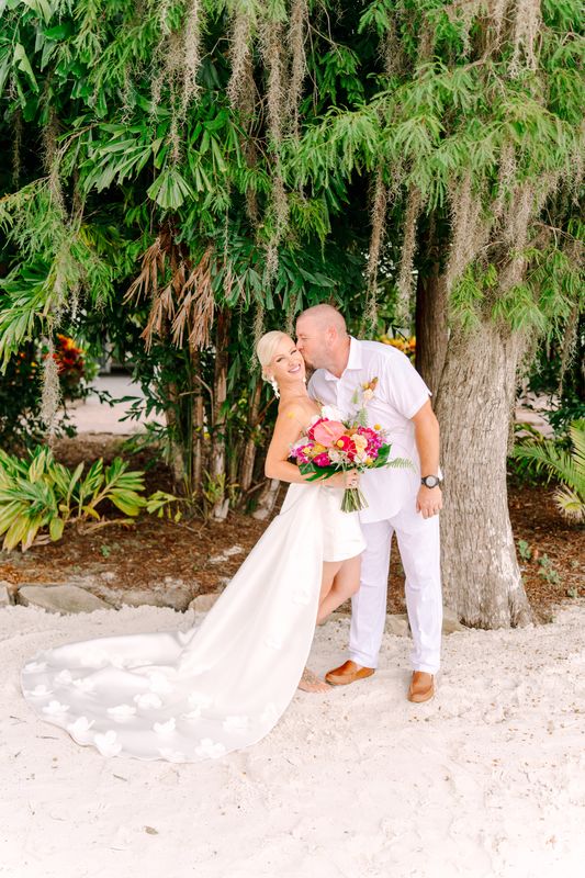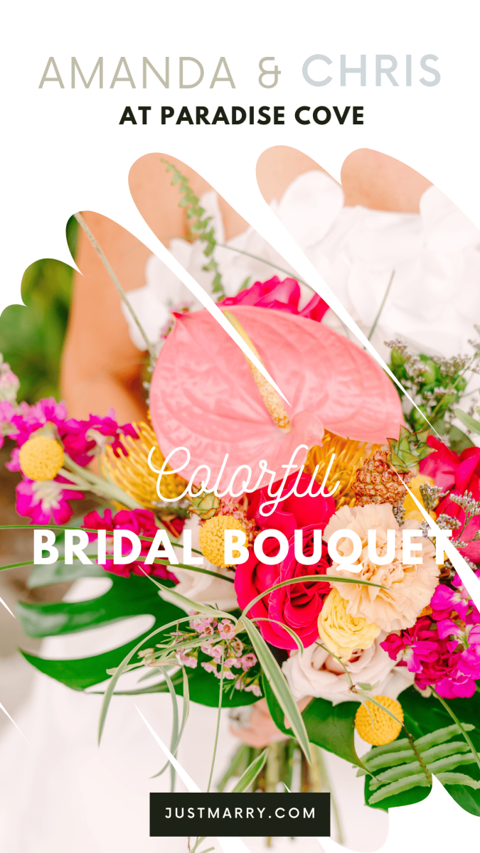 Amanda and Chris celebrated their 25th anniversary with a summer vow renewal at Paradise Cove, complete with a colorful bridal bouquet that perfectly reflected their joyful, tropical style.