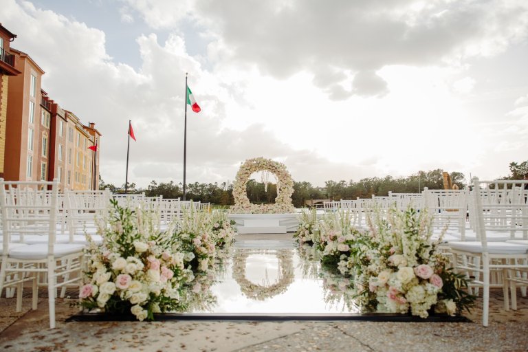 Our insider tip: you can relax before your ceremony in one of the beautiful suites included in the Pavilion, complete with Disney touches like a clock that never strikes midnight and hidden Mickey’s throughout the décor! When it’s time to walk down the aisle to begin your Happily Ever After, your Just Marry! planner will know just where to find you!