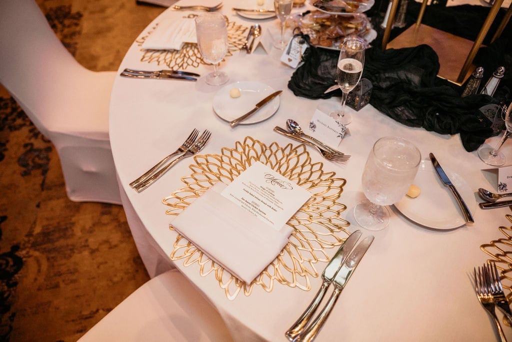 Metallic elements naturally bring a festive sparkle to your wedding décor, but when used sparingly they feel sophisticated and romantic rather than overtly holiday themed. Gold flatware adds instant elegance to your tablescape, and mercury glass votives or candleholders create a warm glow that enhances your lighting. Metallic frames for your signage, table numbers, or seating chart offer a refined touch that catches the eye without overwhelming the design. Even small accents like metallic napkin rings or chargers can elevate your tables in a way that feels seasonal and timeless.