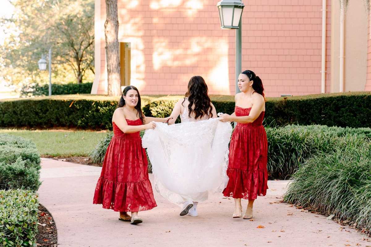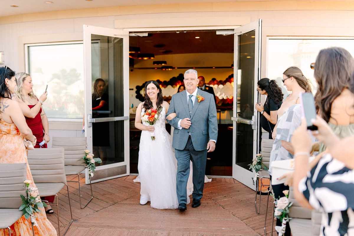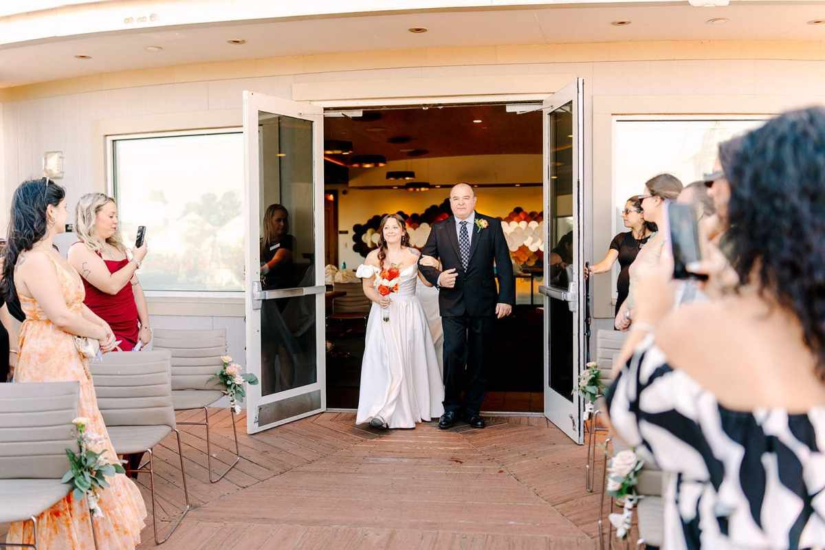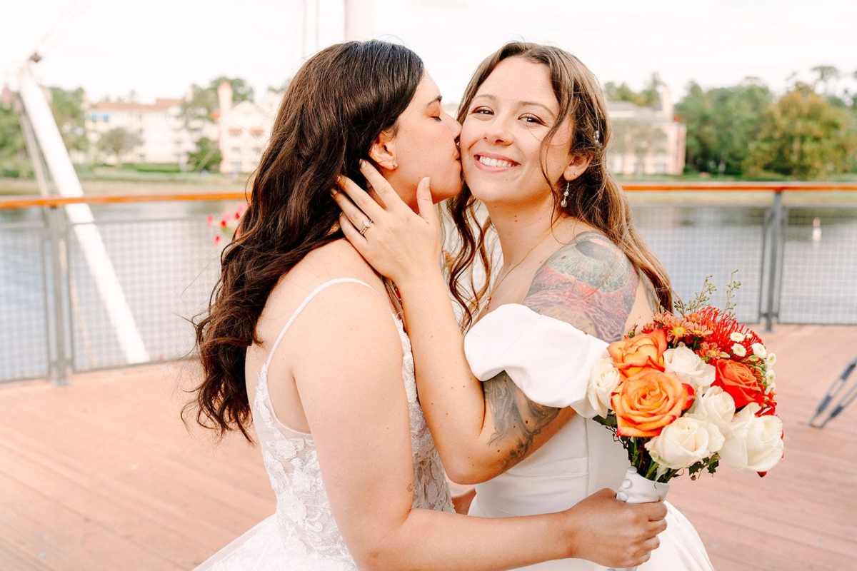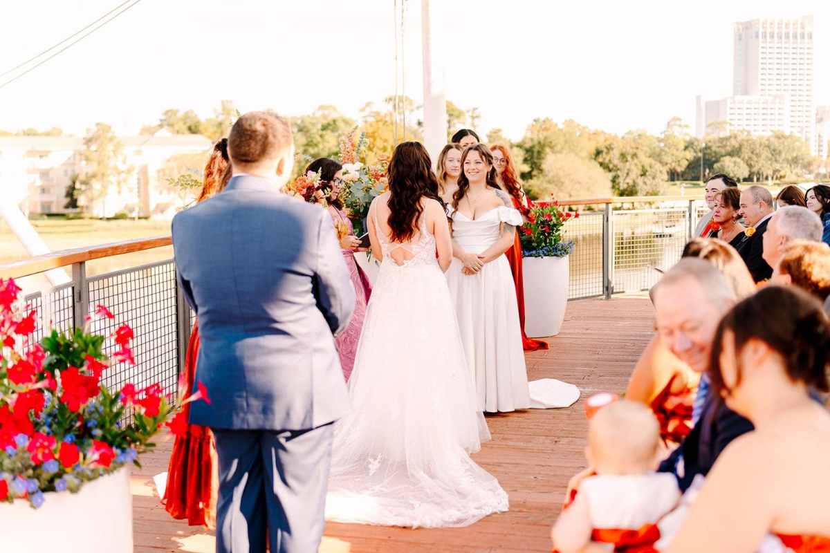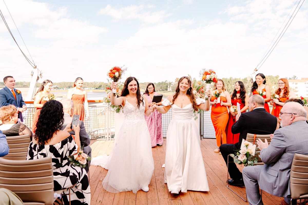 Danielle and Alexandrea chose a fall wedding date that perfectly complemented their seasonal color palette. Rather than arranging transportation, the couple created a memorable moment for their guests by walking together from their hotel at Disney’s Saratoga Springs Resort & Spa to Paddlefish. The short walk turned into a fun and relaxed experience, giving everyone time to chat, laugh, and enjoy the excitement leading up to the ceremony.