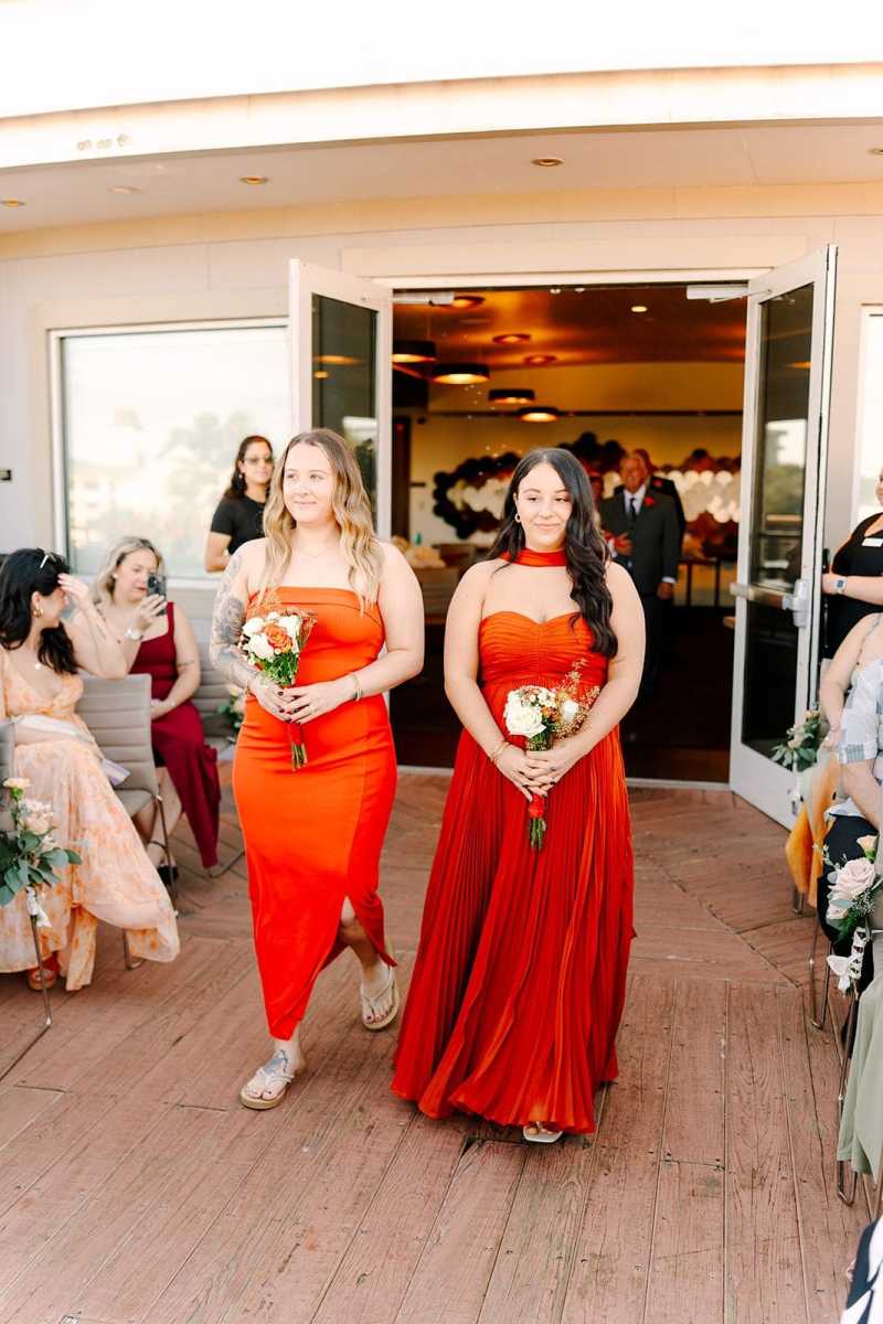 Their celebration beautifully showcased orange wedding color ideas through thoughtful details woven throughout the day. The bridesmaids wore stunning orange dresses that immediately set the tone for the fall-inspired celebration. One of the most meaningful moments came when Alexandrea’s mom officiated the ceremony. She wore a gorgeous floral orange dress that stood out beautifully against the bright blue Florida sky, adding both sentiment and style to the ceremony. The ceremony décor continued the seasonal theme with two elegant floral arrangements placed on pedestals at the altar. These arrangements featured pops of orange and light pink roses mixed with deep burgundy blooms, creating a romantic fall palette that felt both rich and inviting.