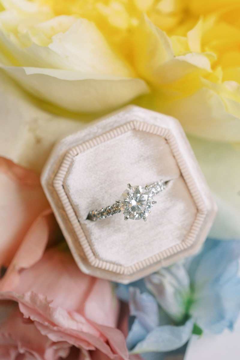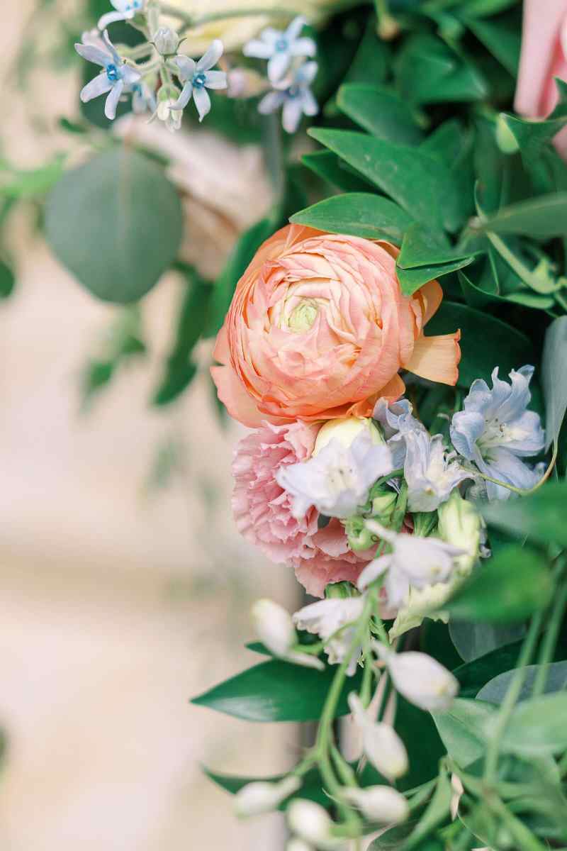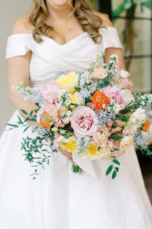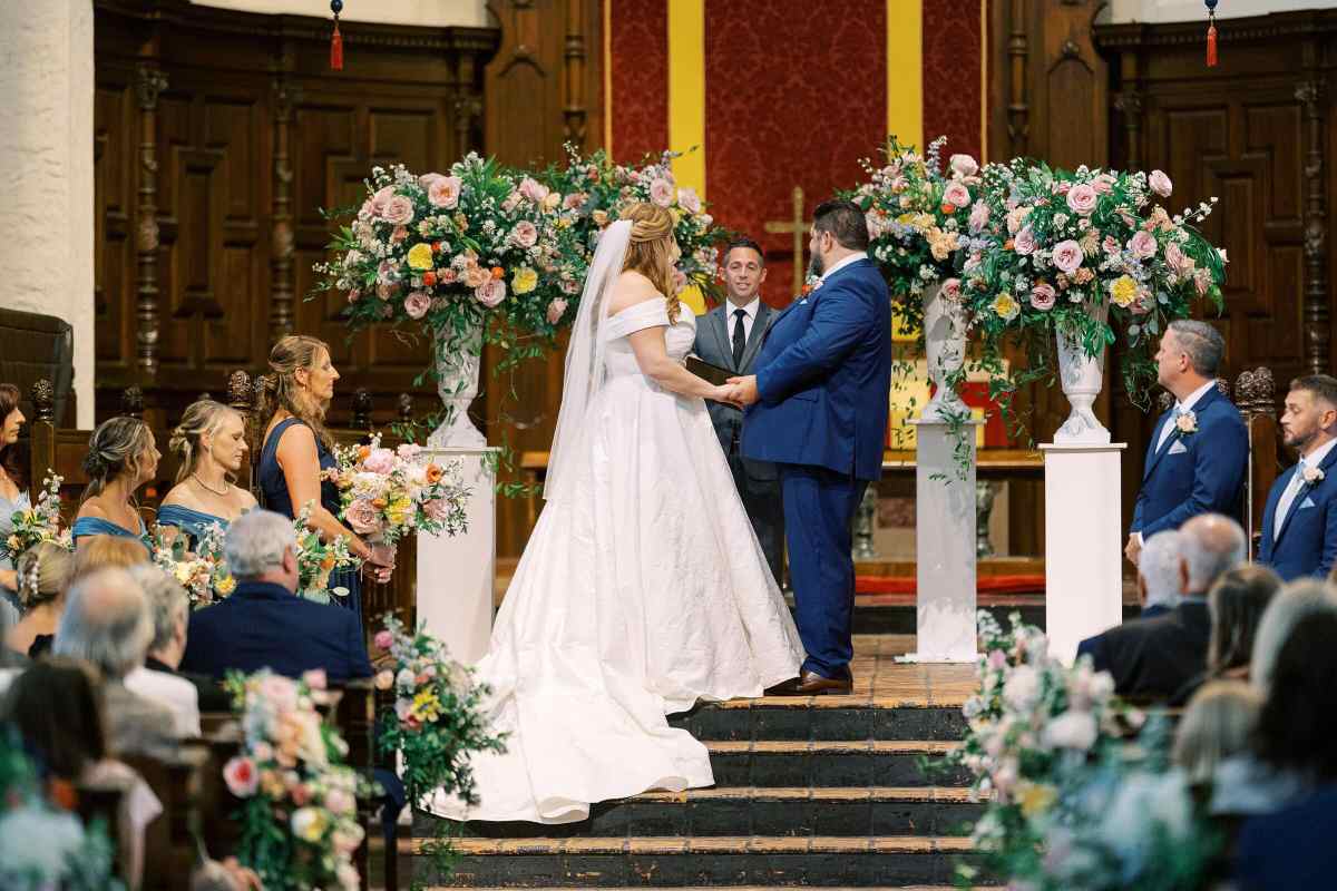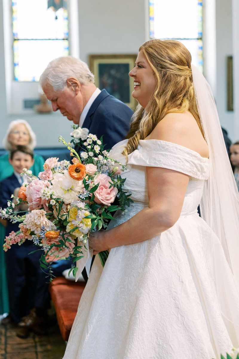 The ceremony took place at the beautiful Knowles Chapel, where the railings were wrapped in lush floral garlands featuring light orange peonies, pink roses, and soft pastel blooms. The couple fully embraced the season, and their use of pastel wedding colors created a dreamy, romantic setting. Sarah’s bouquet tied everything together with the same delicate tones, adding a cheerful pop of color against her classic white gown.