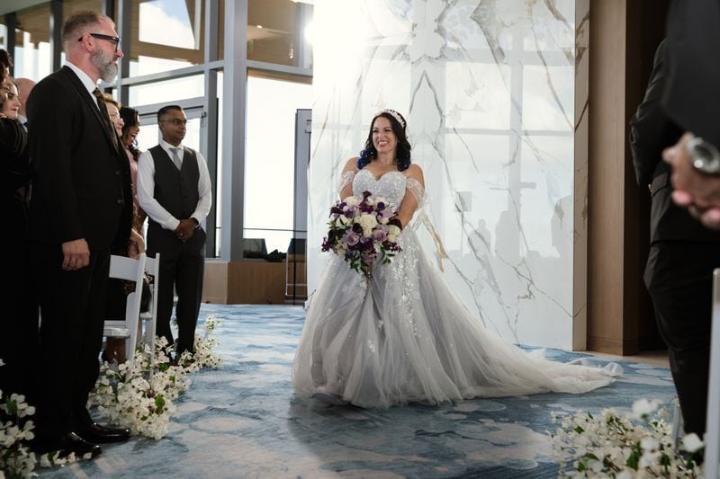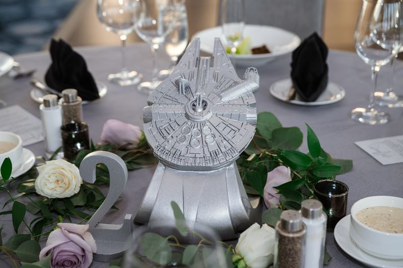 Their wedding colors of gray, silver, white, and purple gave the day an elegant and modern feel, while the Star Wars and Disney touches added a playful twist. Their ring bearer, “Chopper” from Star Wars, sported an adorable bowtie, and Randi even rocked Star Wars–themed sneakers under her dress for a fun and personal touch. The couple created and hand-painted all of their centerpieces, along with custom Lego figures for each guest’s place card. They even surprised each vendor with a personalized Lego version of themselves, a thoughtful gesture that made us feel so appreciated!