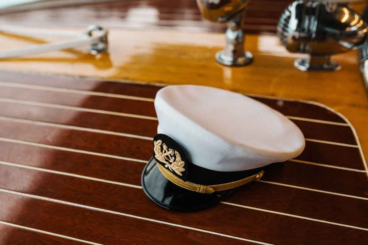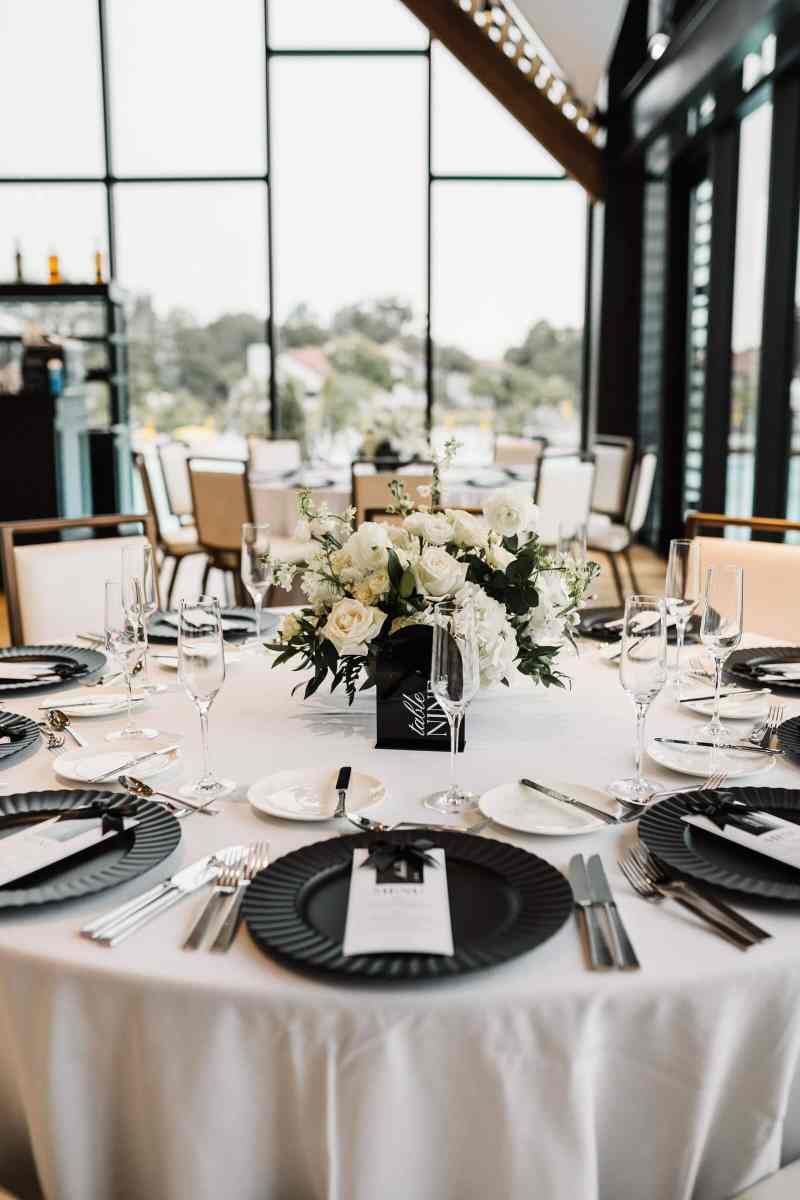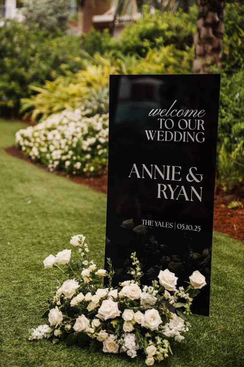 Trendy elements included glow sticks and cowboy hats for the dance floor, a staged boat send-off, a signature drink display with custom bar napkins and stirrers, and coded meal place cards at each guest setting—these details gave a contemporary flair to a classically elegant black-and-white wedding.