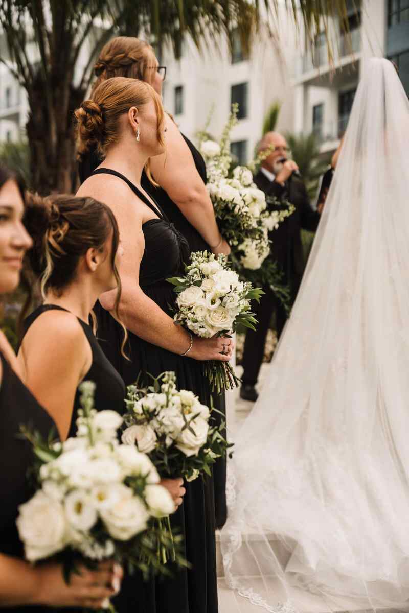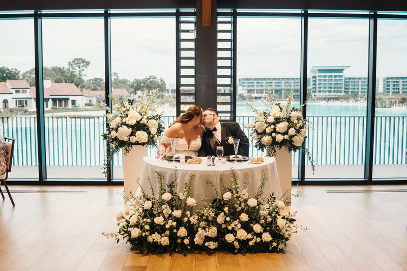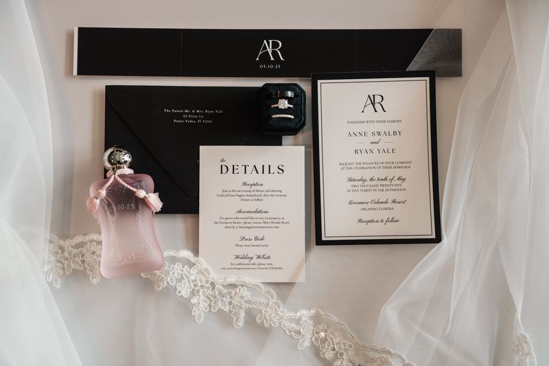 Annie looked radiant in her sparkly embroidered lace gown, which shimmered beautifully in the Florida sunshine. The couple chose a classic black and white color palette that complemented the elegant setting of Evermore perfectly. During their ceremony, Annie and Ryan included a touching unity candle tradition with their parents, a heartfelt moment that symbolized the joining of two families and added a timeless element to their day.