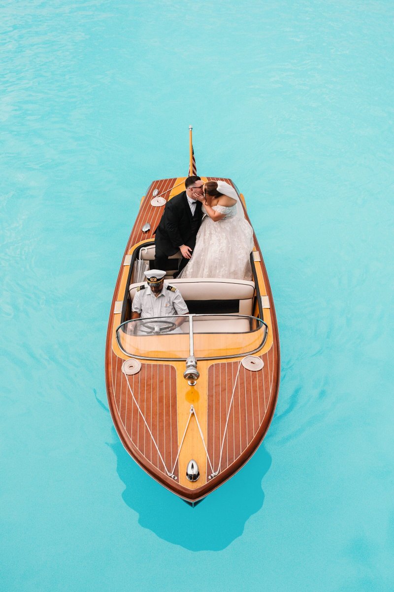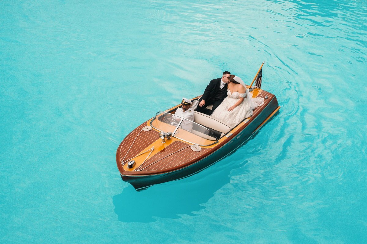 But the highlight of the evening was undoubtedly their unique send-off idea featuring a staged boat departure on Evermore’s crystal-clear blue water. As their guests waved from the shoreline, Annie and Ryan shared one final moment together under the cloudy afternoon light. It was not only a perfect photo opportunity but also an unforgettable ending to a beautiful ceremony.