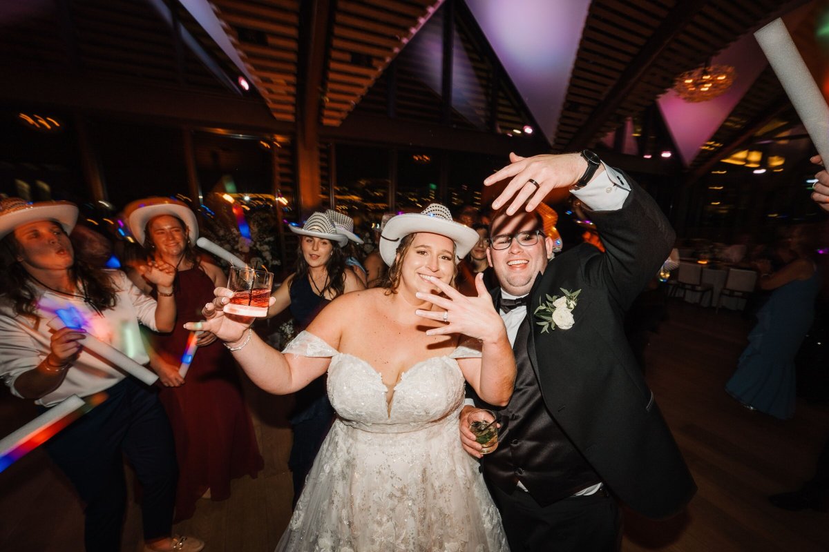 The celebration continued with a stylish reception that showcased the couple’s attention to detail. From the custom bar napkins and signature drink display to the coded meal place cards at each guest’s setting, every design choice reflected a contemporary flair. As the night went on, glow sticks and cowboy hats made their way to the dance floor, keeping the energy high and the guests smiling all night long!