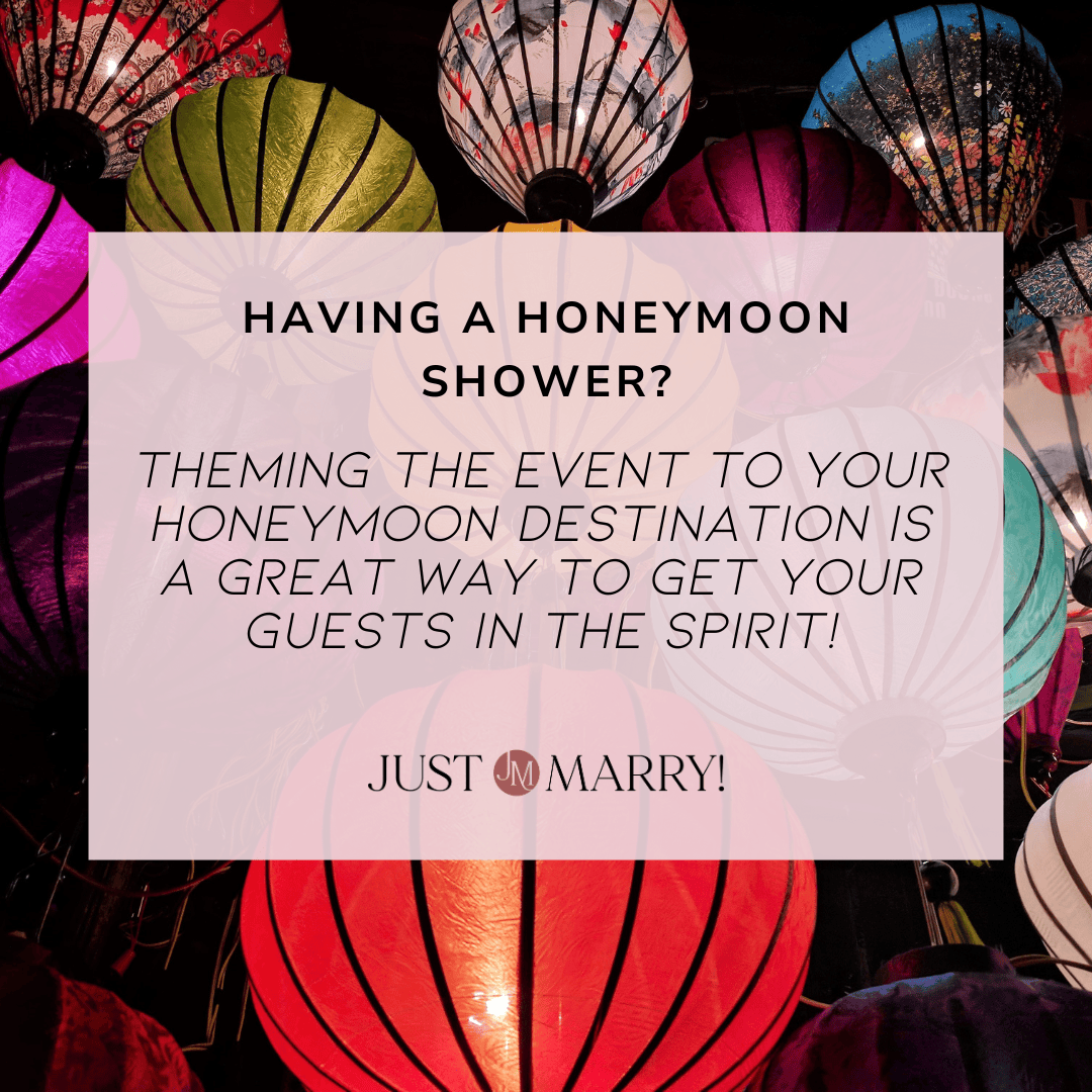 This is among the most nontraditional wedding showers, which makes it unique and fun! If you’ve opted to forgo a traditional registry in lieu of a honeymoon registry, have a shower that’s all about your honeymoon. Theming the event to your honeymoon destination is a great way to get your guests in the spirit!